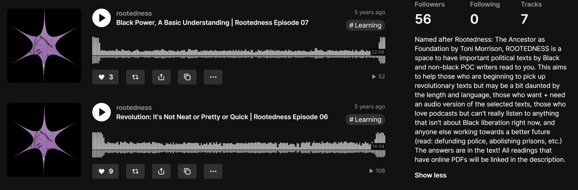 During this time, Kwami also started "Rootedness," (2020) named after Toni Morrison's essay "Rootedness, The Ancestor as Foundation." The project created free audiobooks of selected Black political essays read for free by Kwami. There are total of 7 texts read by Kwami featuring the work of Walter Rodney, Pat Parker, Aime Cesaire, Angela Y. Davis, Huey P. Newton, Audre Lorde, and Amilcar Cabral.